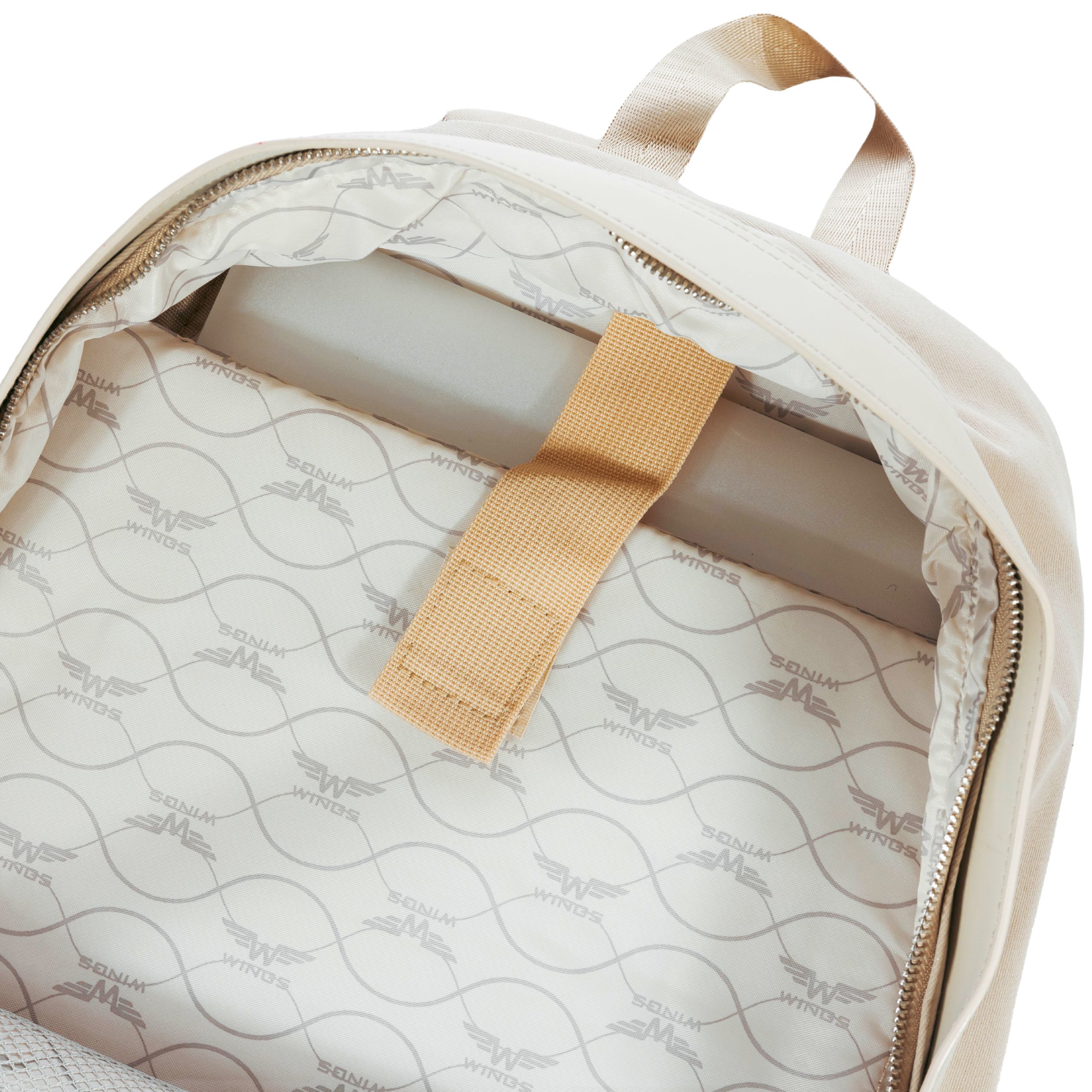 Wnętrze plecaka zostało starannie zaprojektowane, by ułatwić organizację w podróży i na co dzień. Znajduje się tam przegroda na laptopa 15,6", która chroni sprzęt przed uszkodzeniami. Obok niej umieszczono siateczkową kieszeń zamykaną na zamek, idealną na drobne akcesoria, oraz dedykowane miejsce na napój, które utrzymuje butelkę w pionie i zapobiega jej przemieszczaniu się wewnątrz plecaka.